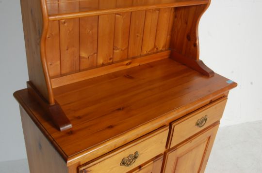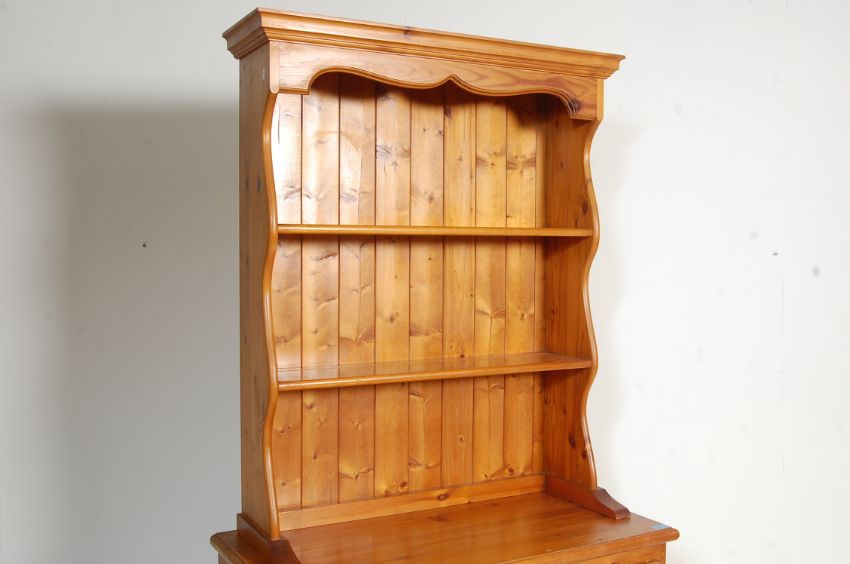 A large 20th Century country pine Welsh dresser. The base having drawers above twin cupboards with knob handles with upright gallery plate rack having flared cornice atop. Dismantles into 2 pieces for ease of movement. Measures, 185 cm H x 94 cm W x 47 cm D
