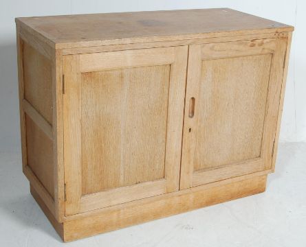 A mid century retro Industrial / Factory school cupboard of low rectangular form with twin fielded panel doors having central shelf set within