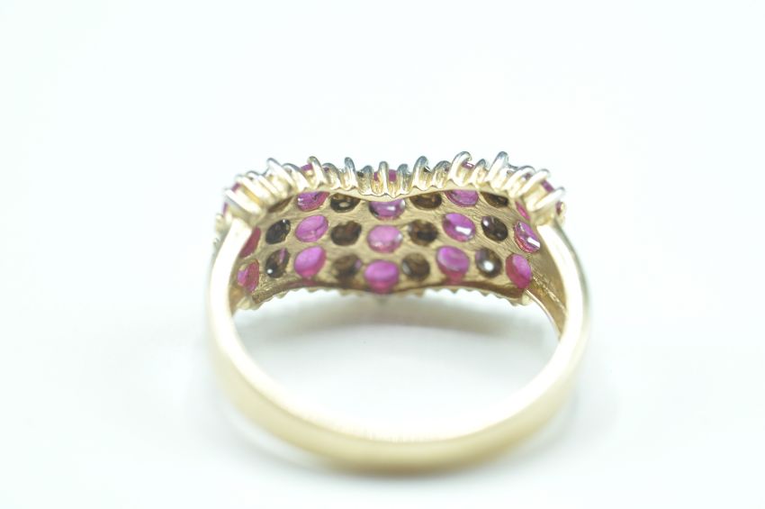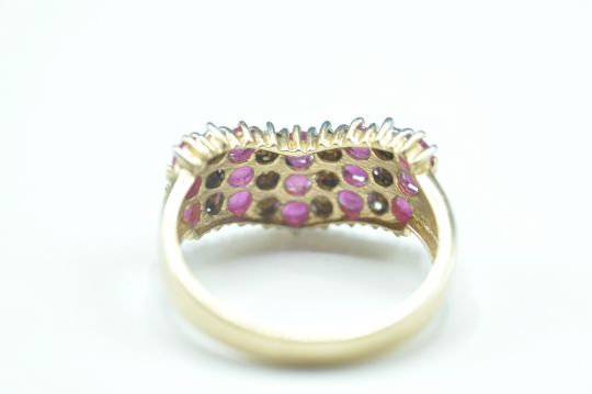 A hallmarked 9ct gold ring having three rows of alternate pink and white stones. Hallmarked Birmingham 2004. Weight 3.5g. Size R.