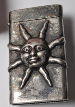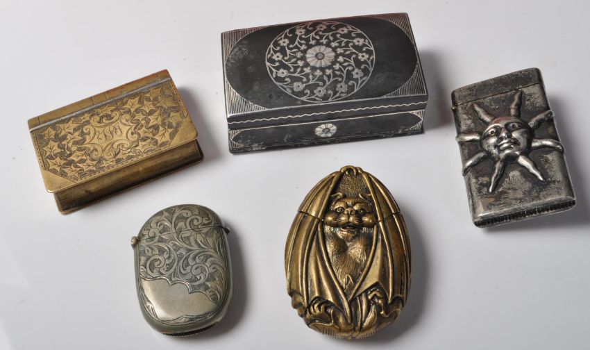 A collection of five early 20th century and later vesta cases comprising of a vesta cases with engraved floral decoration, vintage style bat vesta case, vintage vesta case with an embossed sun and more.