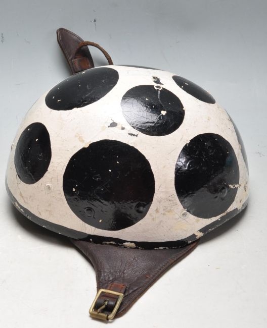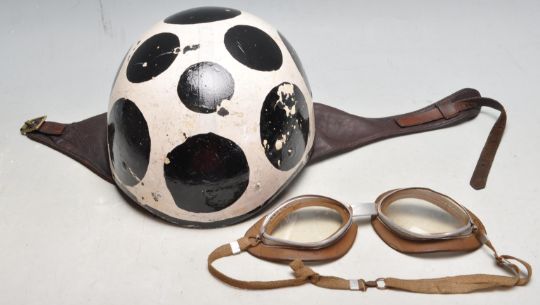 An incredible 1950’s MFG / Norton motorcycle / motorbike helmet having moulded shell, original two pieces brown leather strap, liner and neck cover finished in white with large black circles / dots. Complete with original leather and aluminium goggles. Size 59. 7 1/4.