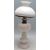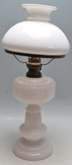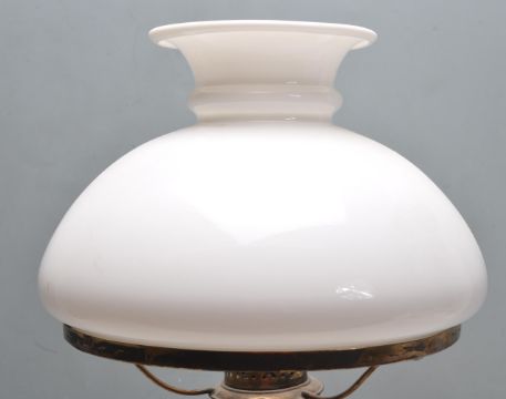 An early 20th century white milk glass table / oil lamp. The white glass body and reservoir with half moon matching white glass shade and brass fittings. 51cm high.