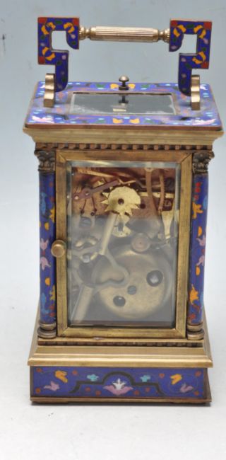 A 20h century French floral turquoise enamel brass case 8 day repeater carriage clock having white enamel dial with Roman numerals to the chapter ring and glass side panels complete with original box and key. 16cm x 10cm x 10cm.