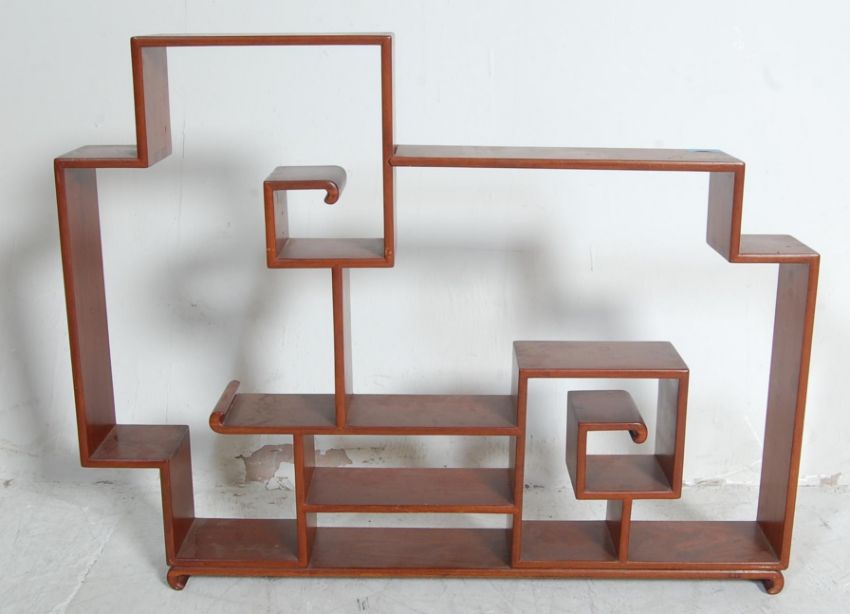 A late 20th century Chinese hardwood open bookcase / collector shelves / porcelain vitrine having an asymmetrical arrangement of shelves raised on curved feet.Measures, 60 cm H x 76 cm W