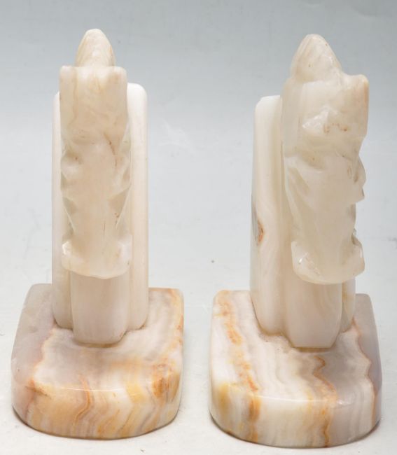 A pair of mid century carved alabaster book ends in the form of horses heads being raised on a plinth bases. 12cm high.