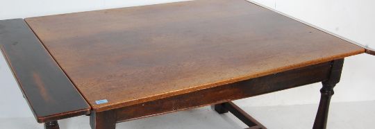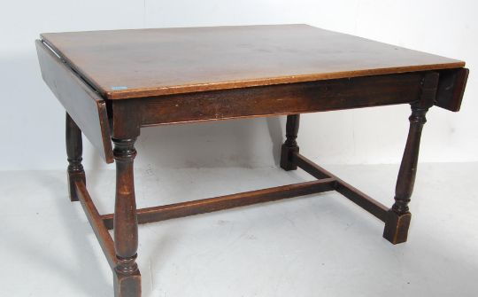 An early 20th century good quality large oak refectory dining table in the 17th century style. Raised on turned legs with peripheral stretchers having fitted frieze with extendable table top having pull out – draw leaves.Measures, 79 cm H x 173 cm W x 105 cm D