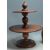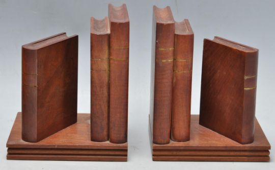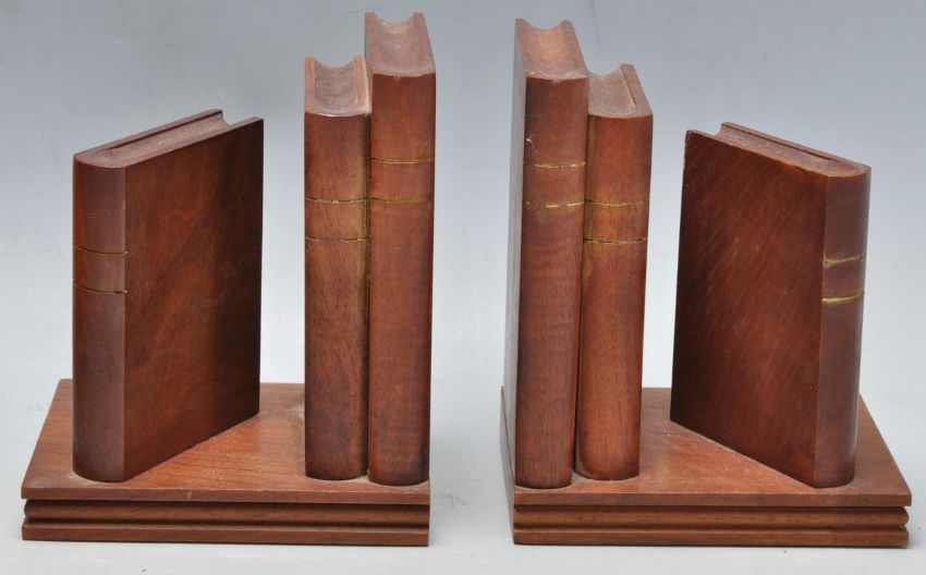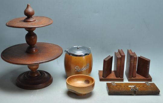 A collection of  vintage 20th century decorative items to include hand carved wooden book ends in a form of books, biscuits barrel, tie press and wooden cake stand with circular graduated trays. 42cm high.