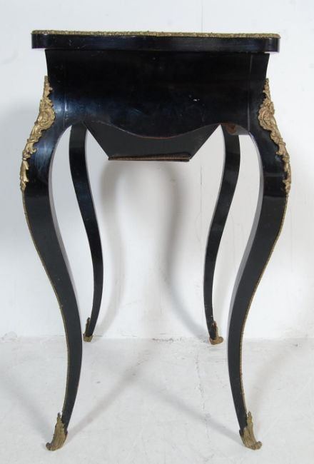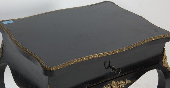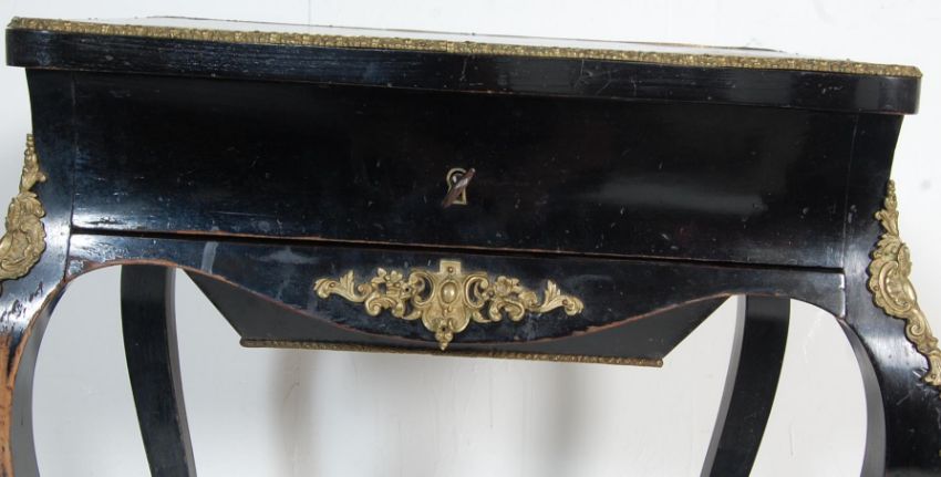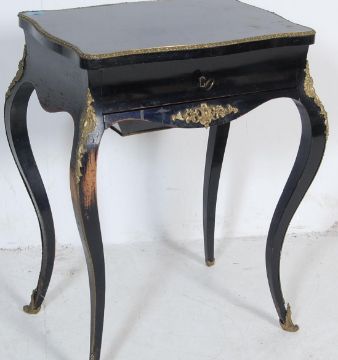 An antique 19th century French Empire  bombe fronted work box table having a hinged lid opening to reveal a fully appointed interior. The sewing box is raised on sabre legs with gilt embellishments to the corners.Measures, 75 cm H x 57 cm W x 41 cm D