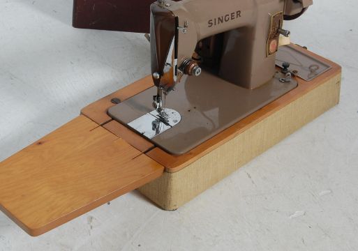 Two retro vintage mid 20th century sewing machines comprising of a Singer 185K together with a Novum sewing machine. Both boxed raised on wooden bases with carry handles to the top.