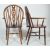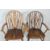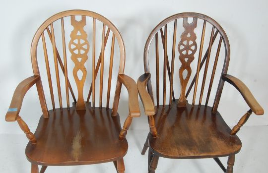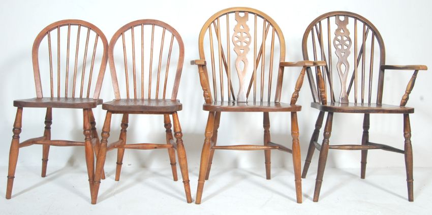 A harlequin set of four vintage mid century kitchen dining chairs comprising of two wheelback Windsor chairs together with two hoop back Windsor chairs both having a saddle seats raised on turned legs united by stretchersMeasures, 100 cm H x 56 cm W x 55 cm D
