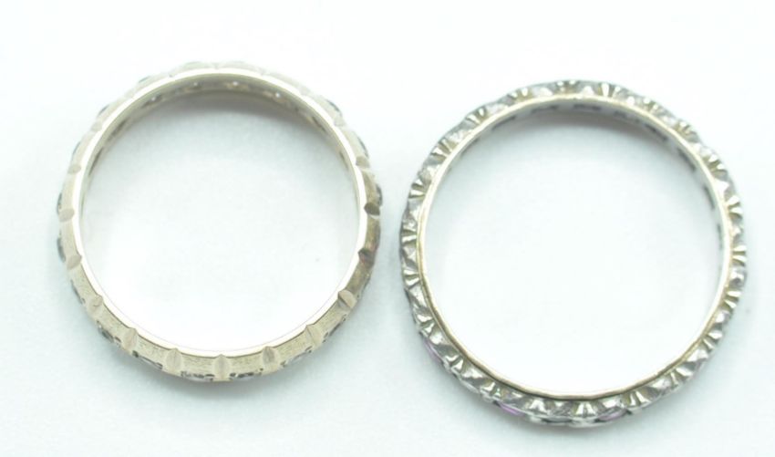 A collection of two ladies dress rings comprising of a  9ct gold ring having white stones throughout. (Size L) Gross weight 3.2g. Together with a stamped 9ct gold plate and sterling silver ring with ruby stones. (Size O) Gross weight 2g.