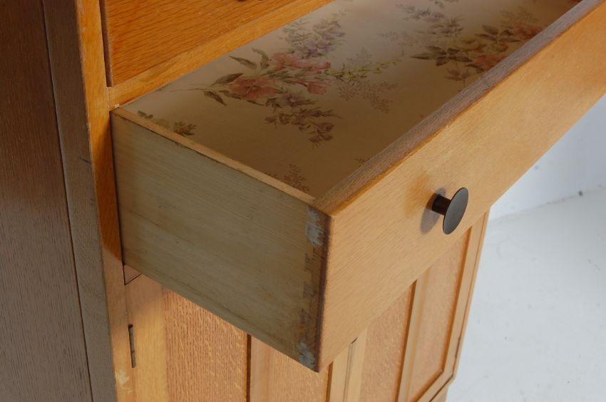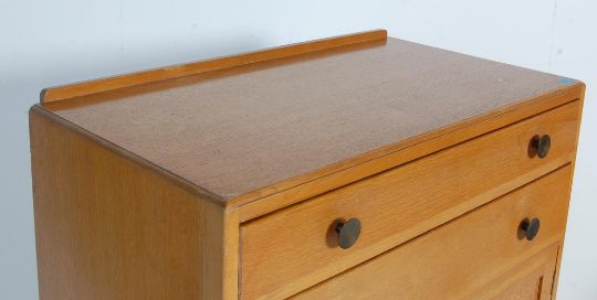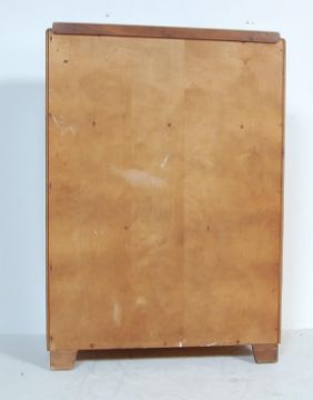 A retro vintage 1960s golden oak air ministry style tall boy chest of drawers having a raised back over two drawers with round metal pulls atop twin panelled doors opening to reveal a shelved interior raised on angled block supports.Measures, 120 H x 84 W x 47 D