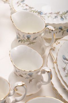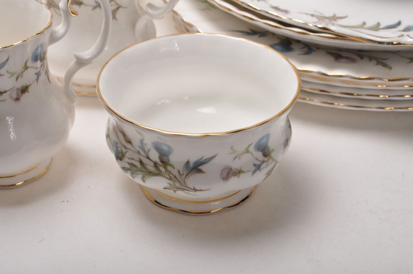 A large and extensive Royal Albert Brigadoon pattern dinner service comprising of cups, saucers, plates of various sizes and shapes, creamer jug, tea cups, coffee cups, etc. Makers stamp to the base. 11cm high