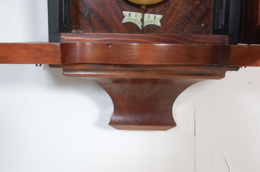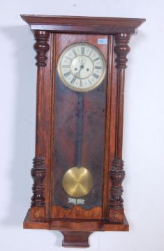 An early 20th century eight day mahogany cased Vienna regulator wall clock having a pediment top flanked by finials over a white enamel clock face with roman numerals to the chapter ring and pendulum below.