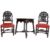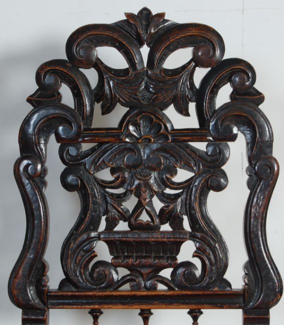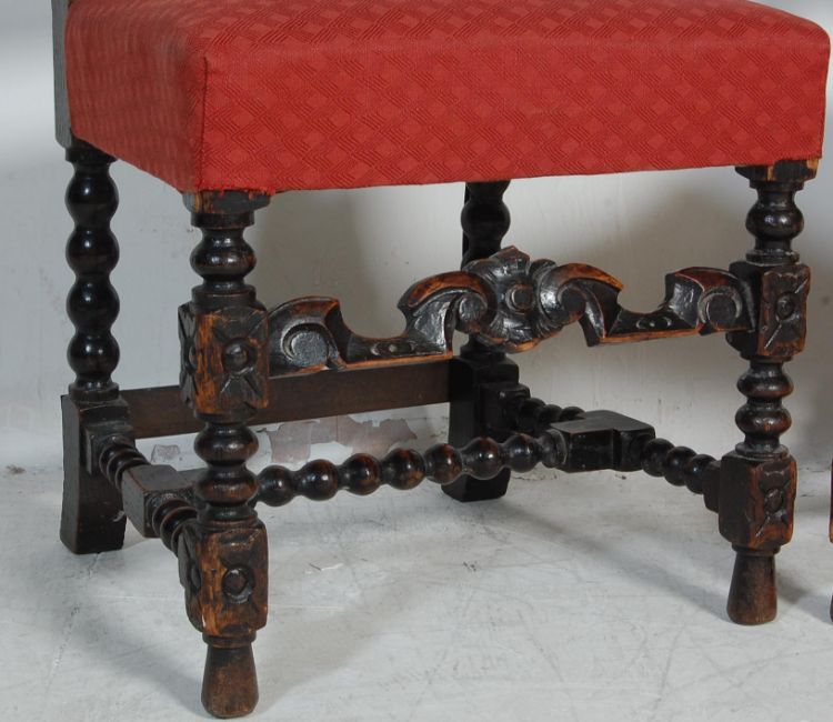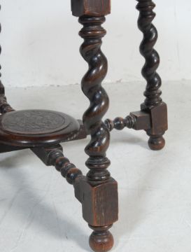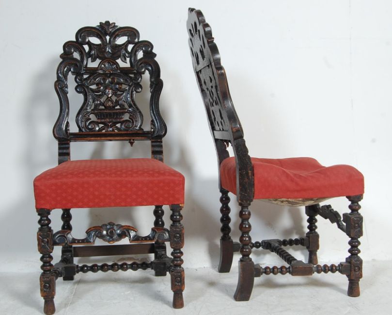 A 19th century Victorian oak occasional table and chairs. The oak table having a circular top being heavy carved with floral motifs, raised on barley twin legs united by stretchers together with a pair of oak frame chairs with heavily carved backrests, stuffed seat, raised on bobbin legs united by H-stretcher in the Carolean manner. Measures, 69 cm H x 80 cm Diameter