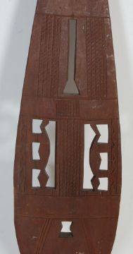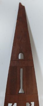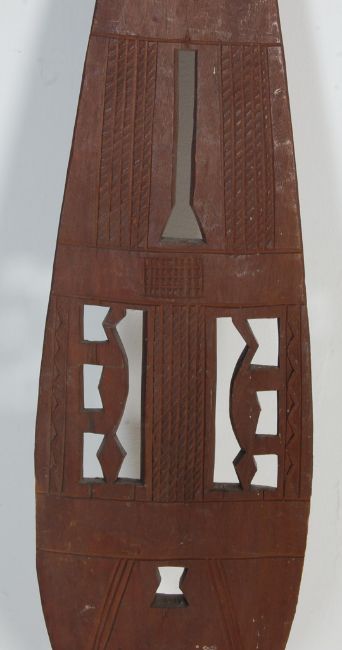 A group of three African tribal carved wooden ceremonial paddles to include two having carved pointed heads with carved pierced decoration with pierced geometric handles, together with another smaller similar example. Measures, 156 cm Tall