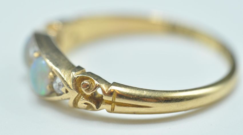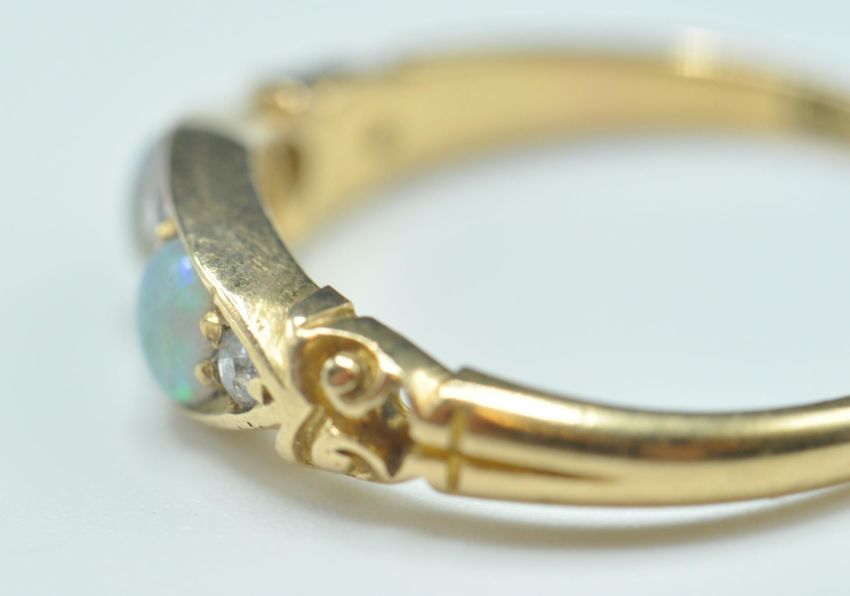 A late 19th Century Victorian 18ct gold ring having a navette shaped head set with two opal cabochons and four round cut diamonds. Hallmarked Chester 1897. Weight 2.7g. Size N. Diamonds estimated at 12 pts.