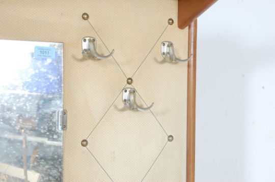 A retro vintage 1960s hall stand of narrow proportions with a slatted hat rack above a vinyl studded back with three chrome coat hooks and a portrait mirror above a glove box with a fall flap raised on a wooden base. Measures, 183 cm H x 64 cm W