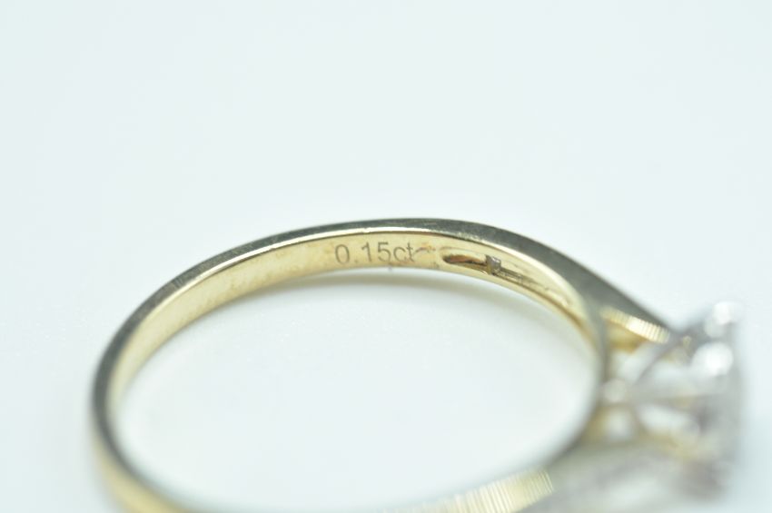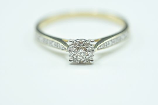 A hallmarked 9ct gold ring having a cluster of diamonds to the head and further diamonds to the shoulders. Assay marked for Birmingham. Inside of the band marked 0.15ct. Weight 1.5g. Size M.5.