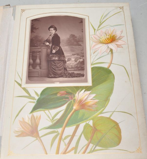 An antique early 20th century family black and white photograph album having a large collection of family portraits.
