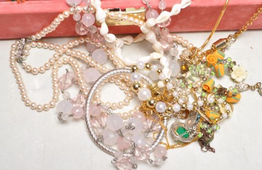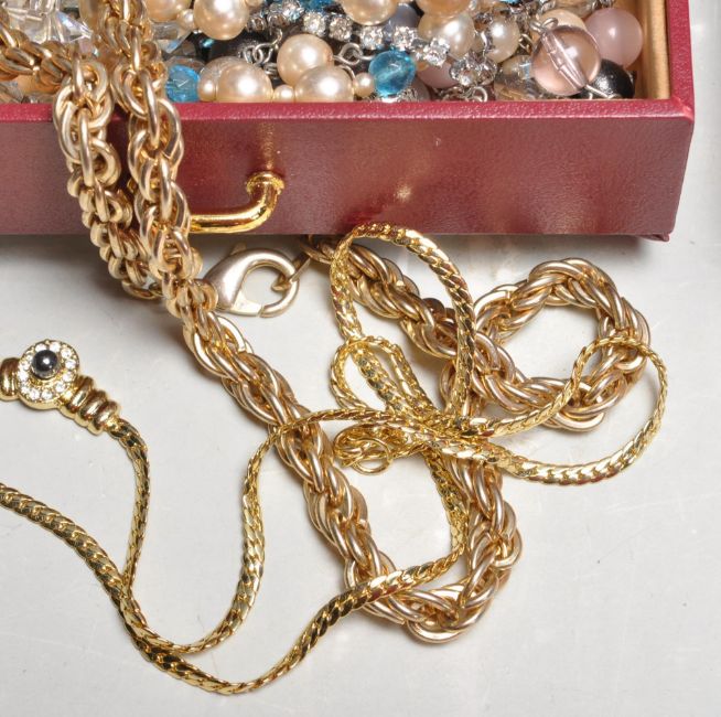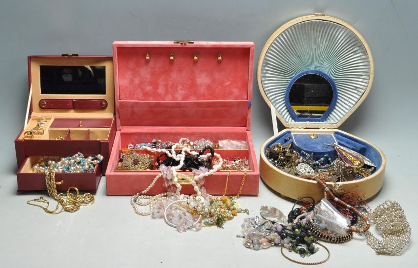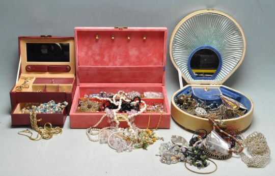 A collection of vintage costume jewellery over three boxes to include yellow metal and white metal rings, necklaces, pendants necklaces, bracelets, beaded necklaces, enamel earrings, etc.