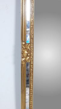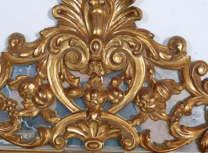 An antique revival contemporary Venetian antique style wall mirror having a central rectangular mirror glass panel set within a gilt frame with 8further mirror panels having a applied scrolled floral garland mount to the top and decoration accents to the corners.