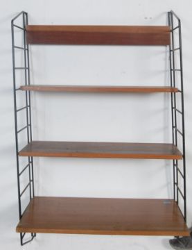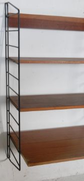 A set of vintage retro 20th century modular shelves / shelving unit in the manner of Ladderax. The set comprising of two metal uprights and three teak shelves.