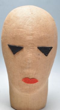 Two vintage 1950s milliners hat stands comprising of a cloth head stand with features sewn in together with wooden bowler hat stand having a circular top raised on a square base. Measures, 30 cm H x 18 cm W