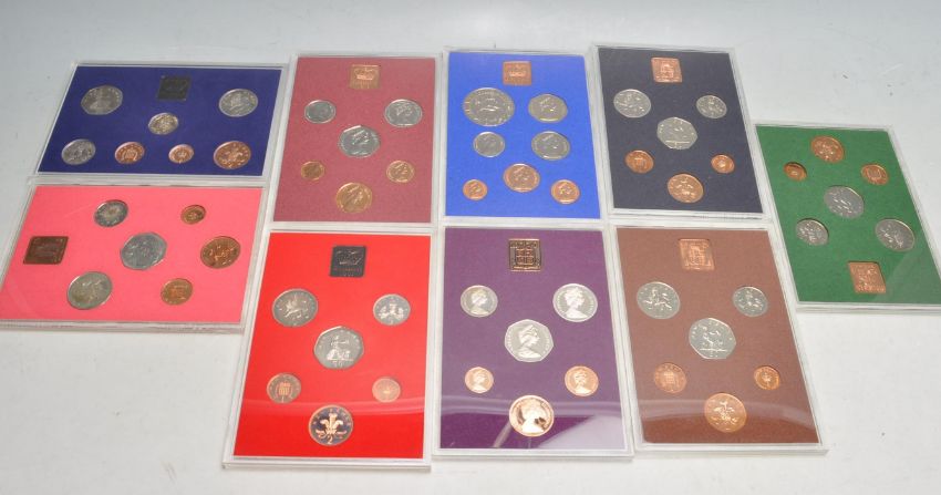 A group of nine Great Britain and Northern Ireland coin sets in sleeves to include 1973, 1974, 1975, 1976, 1977, 1979, 1980, 1981 and 1982.