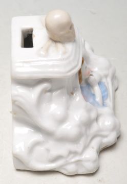 A 19th century Victorian ceramic / porcelain Fairy night light of a tomb form with foliate decoration to the side, angle in prayer to the centre and a skulls to the top.