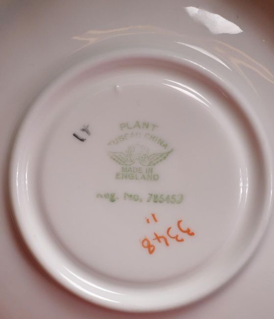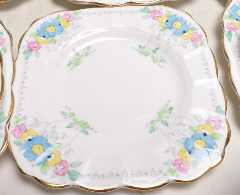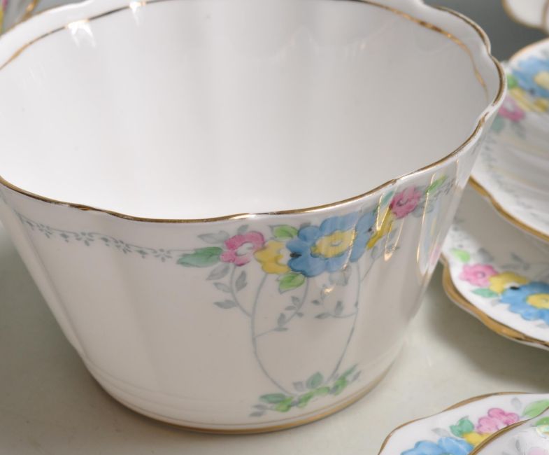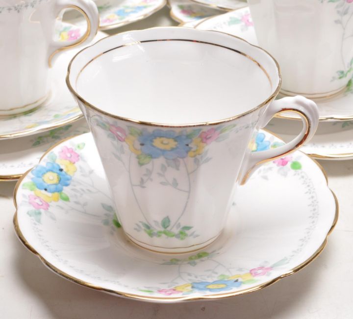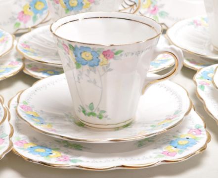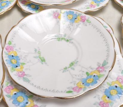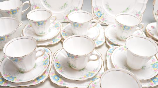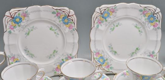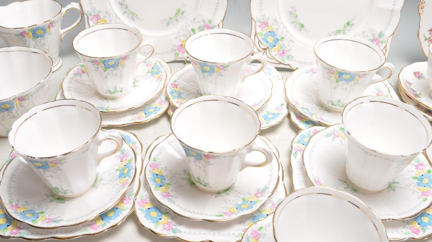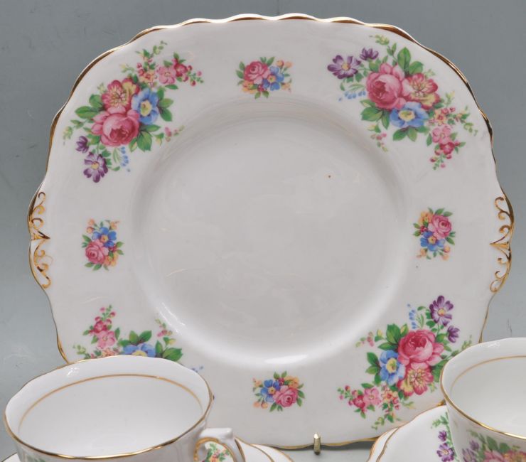 A large and impressive Tuscan Plant tea set comprising of six trios - six cups, saucers, cake plates, two large cake plates / serving plates, creamer jug, sugar bowl along with another six cups and and three saucers all decorated with blue, yellow and red floral motifs along with a Colclough Bouquet Roses pattern bone china five trios tea set comprising of five cups, saucers, plates and a cake plate. Makers stamp to the underside.
