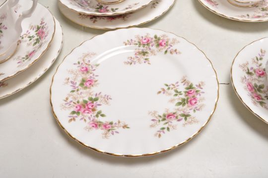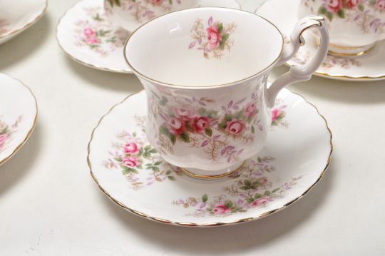 A extensive collection of 47 pieces Royal Albert bone china Lavender Rose pattern tea set and coffee set comprising of coffee cups, tea cups, saucers, cake plates, serving plate creamer jug, sugar bowl, etc. Makers stamp to the base. 26cm diameter