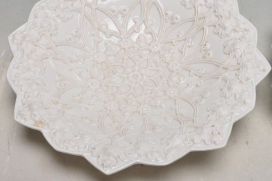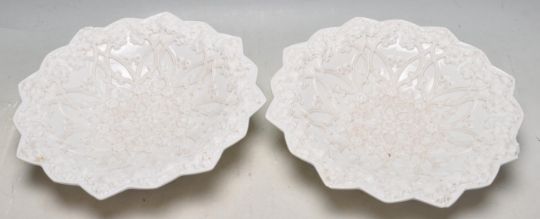 A pair of 19th century Victorian ceramic porcelain Meissen relief fruits bowls / centre pice bowl having and incredible floral relief design decoration to the inside with pointed edges raised on a circular foot with Meissen marks to the underside. AF
