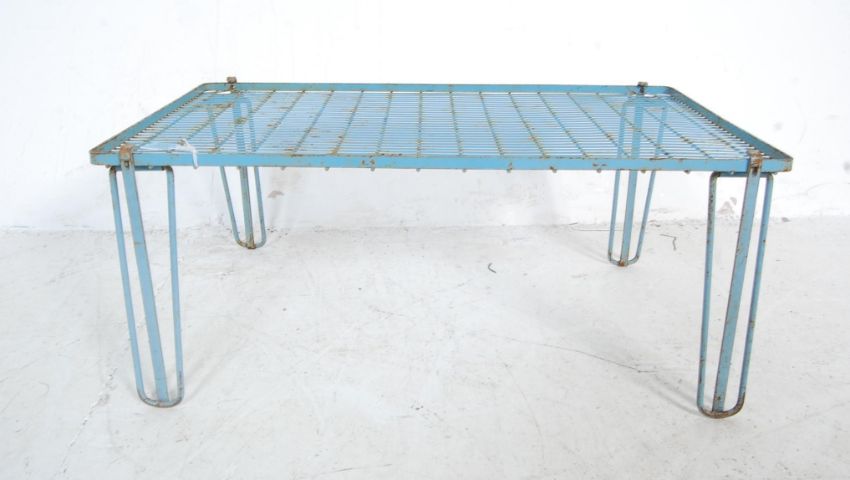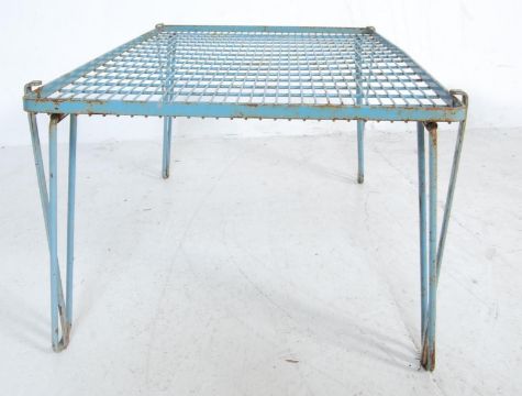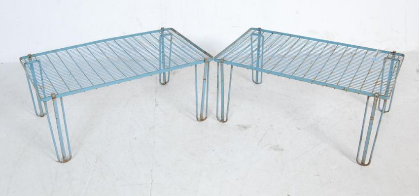 A pair of vintage 20th century blue painted metal wire plant stands of a rectangular form with hairpin style legsMeasures, 27 cm H x 60 cm W x 35 cm D