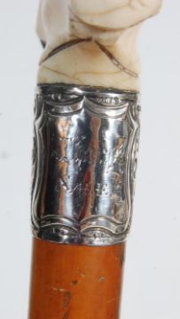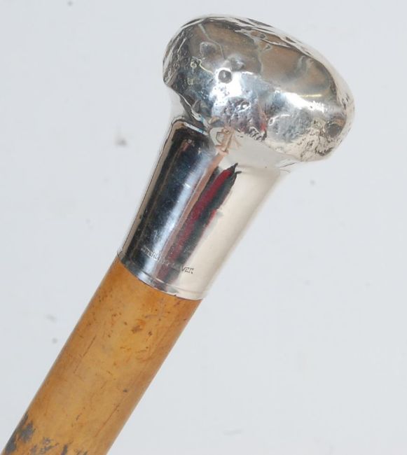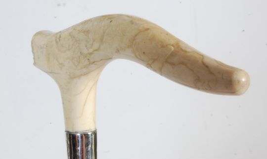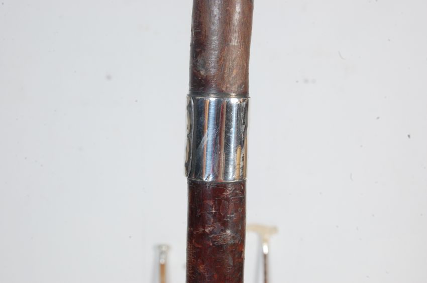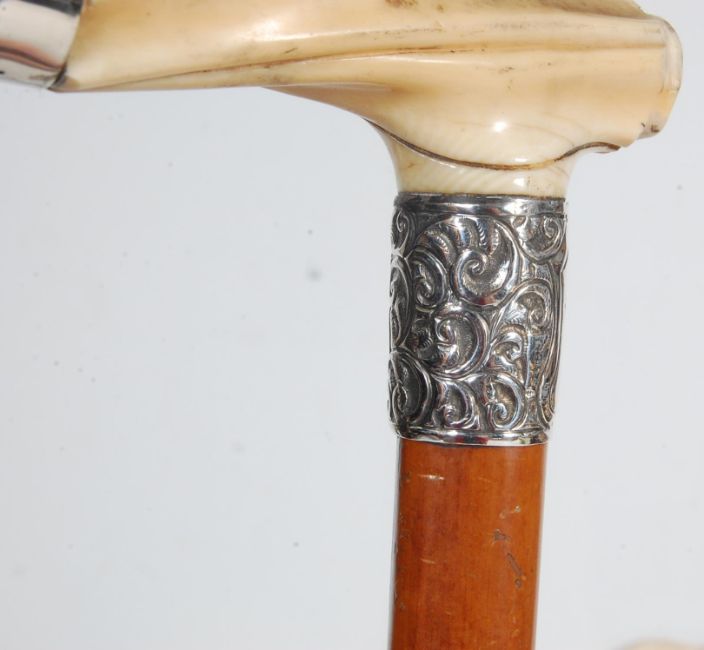 A collection of four antique Edwardian and later walking sticks comprising of a bone handled walking cane with chinese oriental scenes carved above a silver collar, a bone handled walking stick stick with silver hallmarked collar, a malacca walking stick with hallmarked silver pommel together with another walking. Largest measures 92cm.