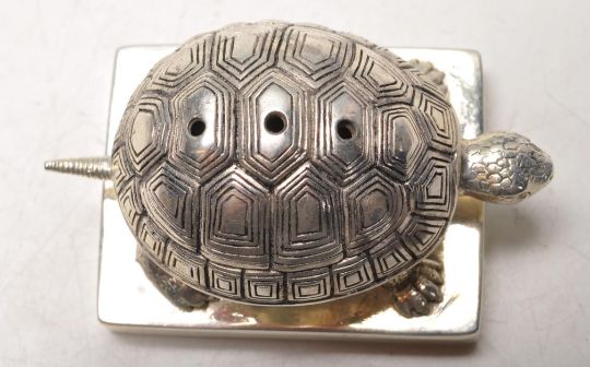 A pair of stamped .925 silver plated tortoise salt and pepper condiment shakers having pierced shells with stylised etched features raised on a square base. Gross weight 155g. Measures 5cm wide