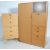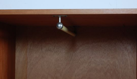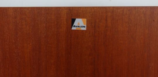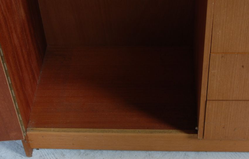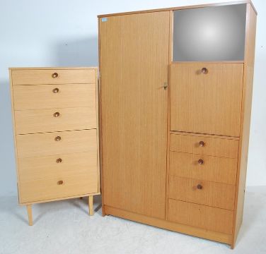 A mid century teak wood upright pedestal chest of drawers. Raised on an inset plinth base with an upright bank of drawers all with recessed oval pull handles. The drawers with teak linings. Together with an Avalon combination wardrobe with upright robe, drawers and cupboard with mirror frontMeasures 152 cm H x 100 cm W  x 43 cm D