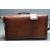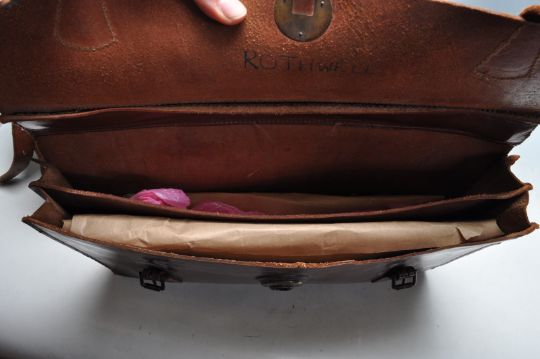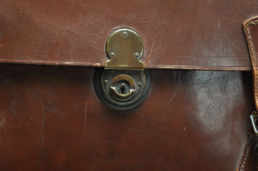 A mid century brown leather photograph bag of a rectangular form with three lock straps, handle to the top and adjustable shoulder strap along with a smaller brown briefcase with brass lock. Measures 30 x 45 x 20cm.