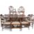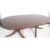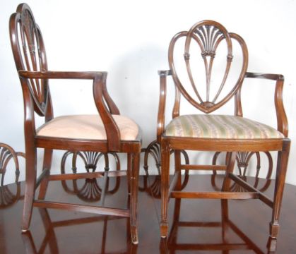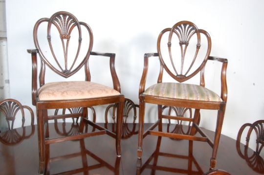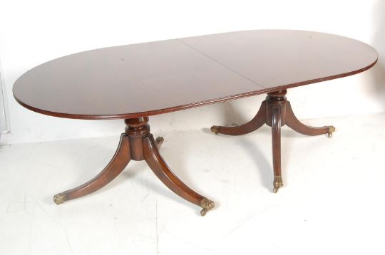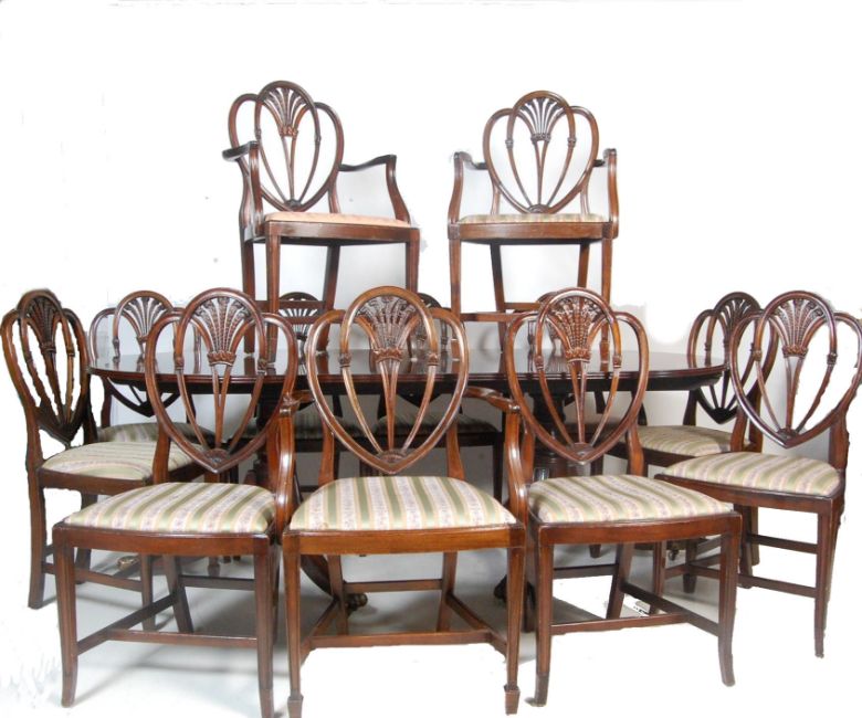 A matched set of 12 Regency revival  mahogany Hepplewhite dining chairs, 6 being stamped for Harrods of Knightsbridge, London. Together with a twin pedestal Regency revival mahogany dining table. The chairs being raised on tapering legs with drop in upholstered seats with pierced Hepplewhite wheatsheaf back rests. The dining table raised on turned column pedestals with splayed feet having hairy paw cap castors.