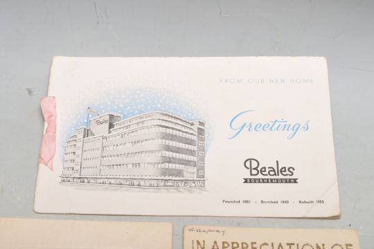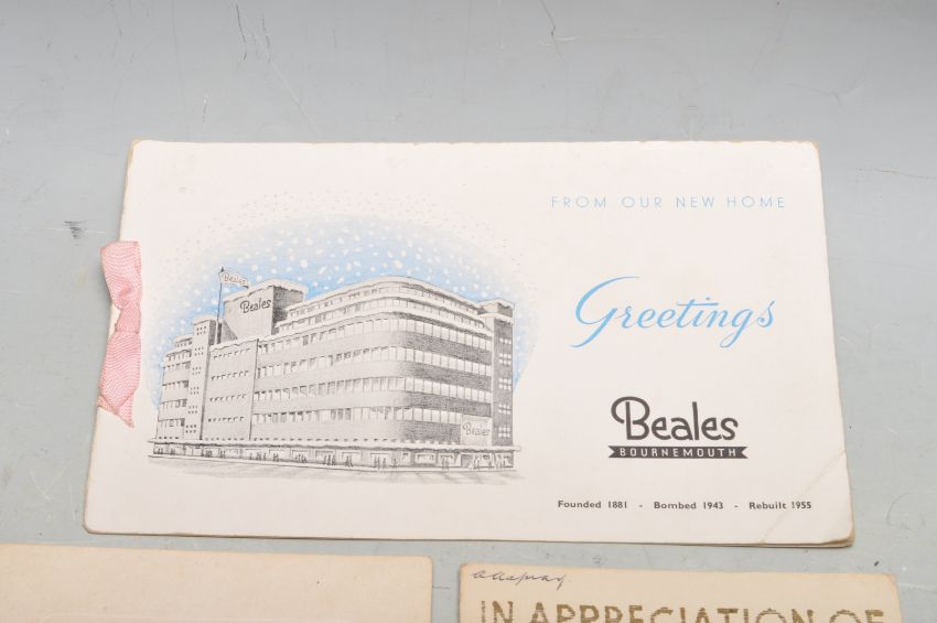 Beales Department Stores - a collection of x3 1950s items of ephemera relating to the famous department store, comprising; a ' J.E Beale - Eastbourne ' booklet detailing the various departments and where to find them, a Beales of Bournemouth greetings card, and a ' 21 Years Or More Celebration Menu ' for those long-serving staff. Interesting selection, likely from an ex-employee.