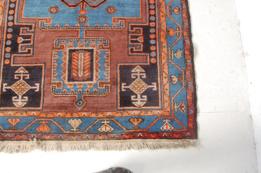 A 20th century  hand woven and natural vegetable dye new wool on cotton Northwest Persia Malayer carpet rug having a large blue, black and vibrant orange medallion to the centre flanked by two smaller medallions with matching colour scheme, lozenge diamond to the corners, vibrant blue main border decorated with continental flowers, orange inner border, brown outborder with pile direction to each side and white fringe to each end. Flatweave / Kilmer to the top end. Measures, 215 cm H x 140 cm W