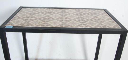 A vintage retro 20th century tile top console table / plant stand having top and bottom shelf covered with cream and brown tiles with geometrical design raised on square tubular frame. Measures, 72 cm H x 71 cm W x 39 cm D