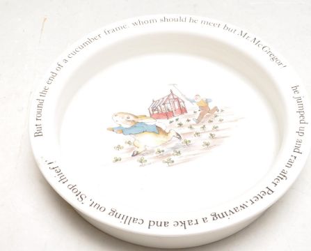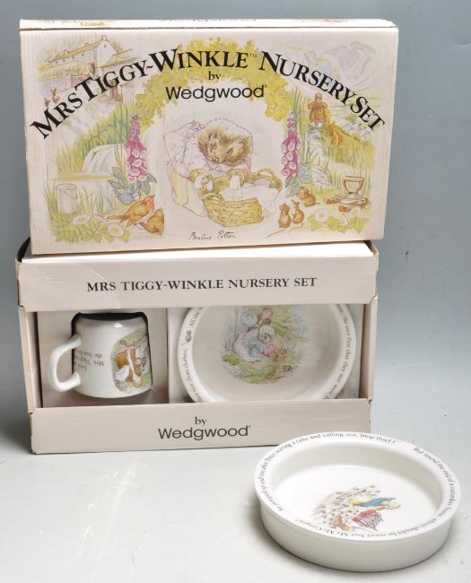 A vintage 20th century Beatrix Pottery Mrs Tiggy - Winkle Nursery set by Wedgwood in original presentation box along with a Peter Rabbit dish / plate. Makers stamp to the underside.