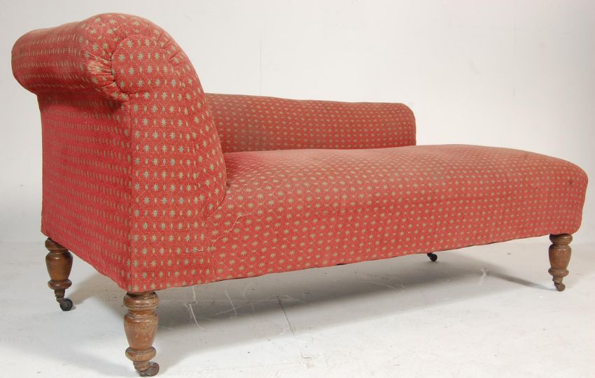 A 19th century Victorian Chaise longue having a shaped back and elbow rest upholstered in dark red fabric raised on turned legs with castors.Measures, 75 mc H x 160 cm W x 63 cm D