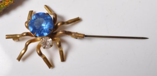 A collection of vintage late 20th century insect / animal brooches comprising of a frog, tortoise, butterfly, lizard, spider and more. Some having enamel polychrome decoration and studded with coloured stones. 65mm long.