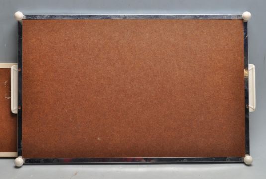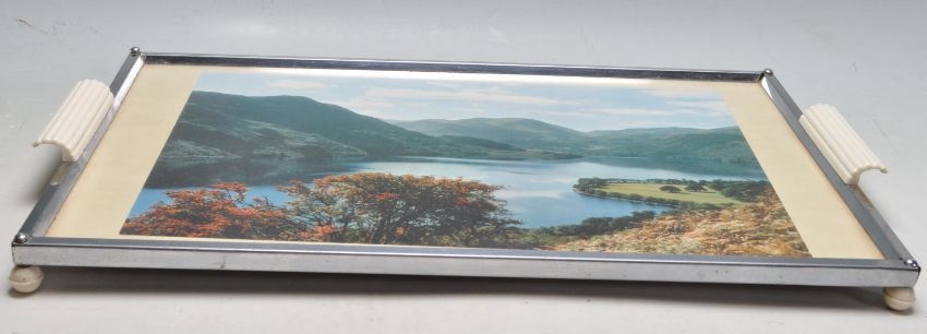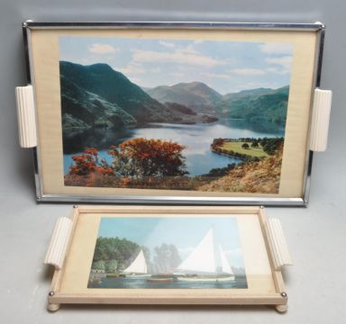 Two vintage retro mid 20th Century serving trays each having British lake scene photographs behind glass to the centre, with moulded handles all raised on white plastic moulded feet.  50cm x 30cm