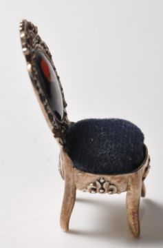 A stamped 925 sterling silver pin cushion in the form of a chair having an enamelled panel with a classical picture to the backrest and blue velvet cushion. Marked 925 sterling to the base. Weight 9.8g. Measures 4.5m tall.