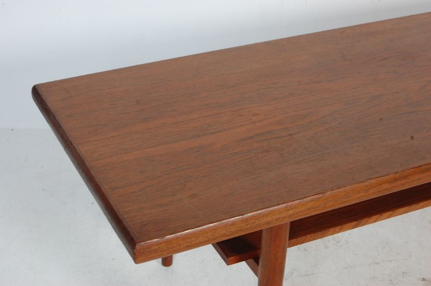 A large vintage retro Danish inspire teak wood Long John coffee table of a rectangular form with shaped edges raised on turned tapered supports united by a solid magazine rack