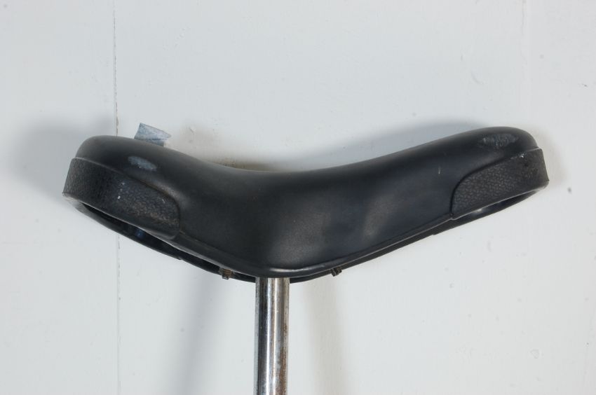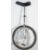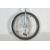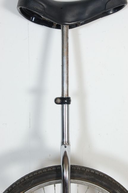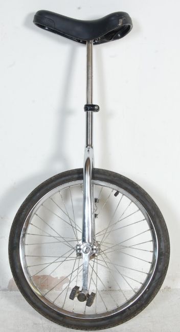 A contemporary aluminium unicycle having a cushioned saddle over a metal frame with pedal driven direct drive. Measures 100cm high. Wheel Diameter 42cm