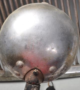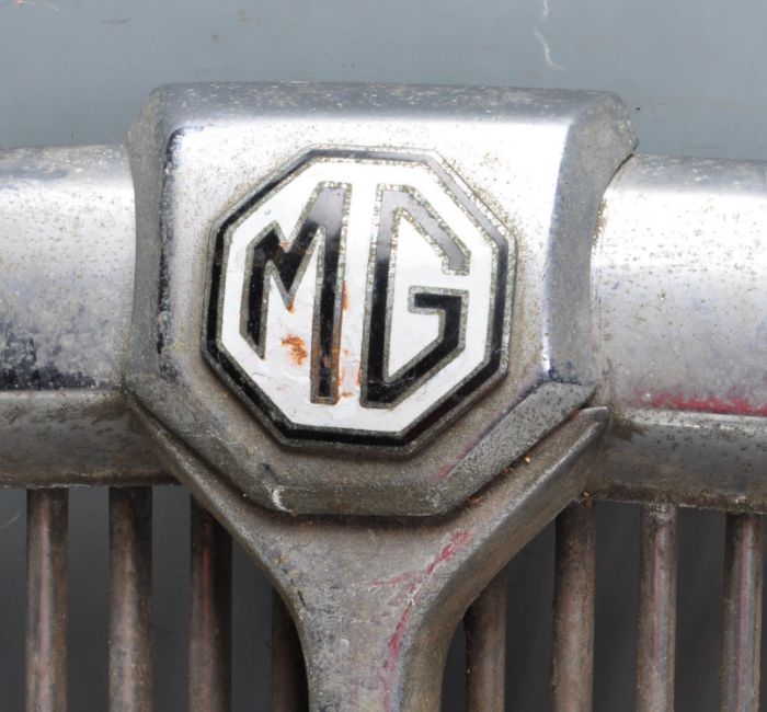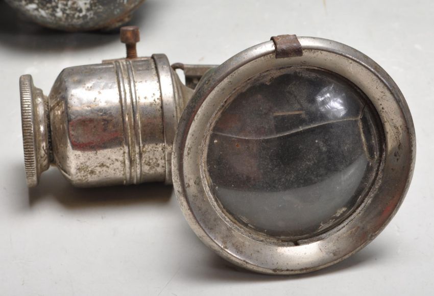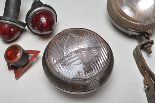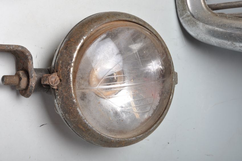 Of automobile interest - A vintage mid 20th century MG Magnetic MK III front grill together with a collection of vintage car lights. The collection of car lights includes a Marchal 640 Virage Et Brouillard Made In France Lamp, a Marchal 642 Virage Et Brouillard Made in France Lamp,  Powell & Hanmer Panther carbide lamp to suit vintage motorcycle or bicycle and more,